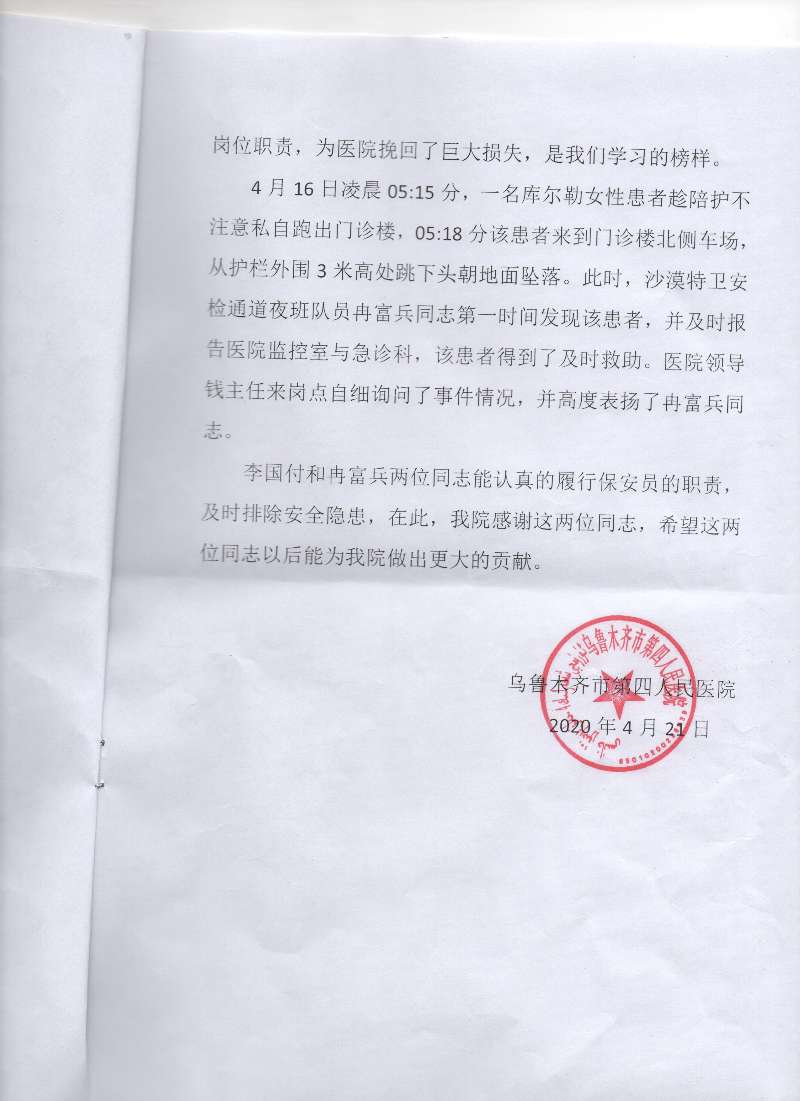 四醫院保安人員為醫院挽回損失-先進事跡